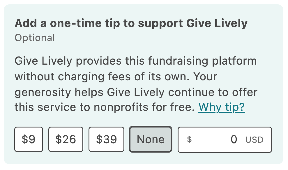 Notably, each voluntary contribution is in addition to the donation being made to a nonprofit, with no effect on the final donation amount the nonprofit receives.